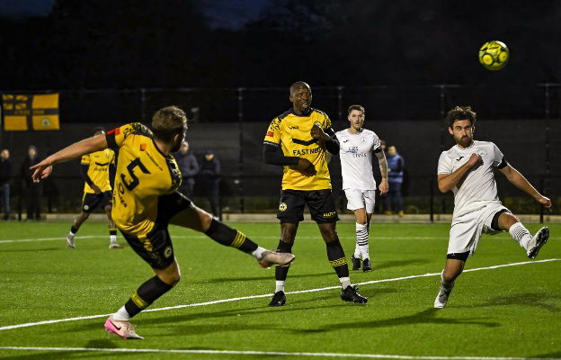 Prichard’s long-ranger was well off-target and a ball towards him shortly after earned Chichester a first corner after the ball struck Prosper Keto which the No11 took.